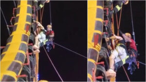 A equipe de manutenção do parque de diversões não conseguiu destravar o brinquedo, por isso o Corpo de Bombeiros foi chamado para resgatar as pessoas, que ficaram cerca de 40 minutos presas no aparelho.
