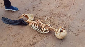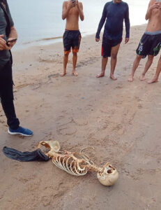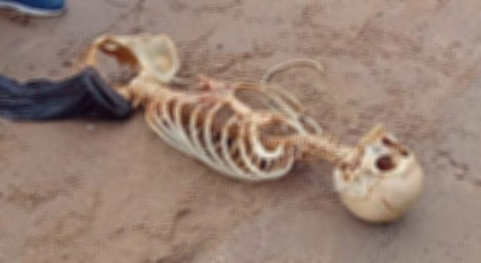 Os banhistas disseram que caminhavam pela praia e encontraram os restos do cadáver, que possui crânio, coluna vertebral e costelas.