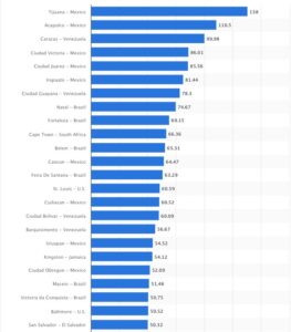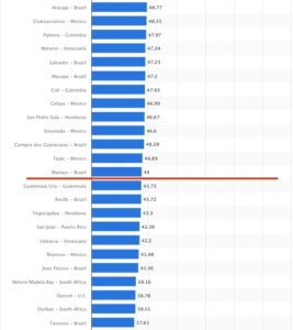 Com 40 homicídios por 100 mil habitantes, a capital do Amazonas está entre as 100 cidades mais perigosas do mundo em 2022, de acordo com dados obtidos com o Conselho Cidadão para a Segurança Pública e a Justiça Penal do México. No ranking, Manaus ocupa a 37ª posição de cidade mais perigosa. A capital do Amazonas deixou para trás outras cidades brasileiras conhecidas pelos altos índices de violência, dentre elas Recife, que ocupa o 39º lugar, com uma taxa de 43,72 homicídios por 100 mil habitantes.