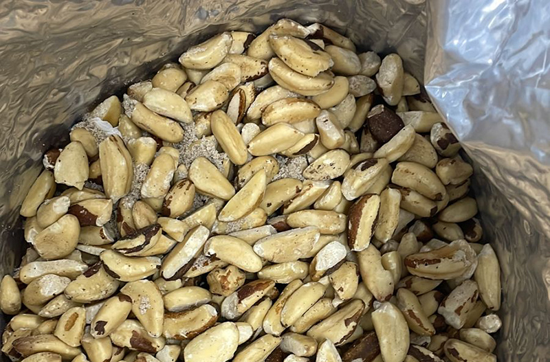 Após realizar procedimentos de análise de risco aduaneiro, a fiscalização identificou carga de castanha saindo de Manaus para São Paulo com suspeitas de presença de drogas. Com a verificação da carga foram descobertos 53,8gk de maconha em 8 volumes de castanhas.