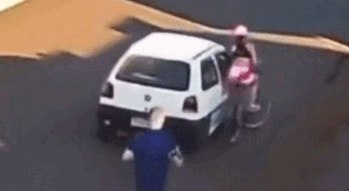 A câmera registrou o momento que um carro se aproximou da ciclista e, em seguida, o carona passou a mão no corpo dela. Com isso, a vítima caiu no chão. Os envolvidos saíram com o carro em seguida.